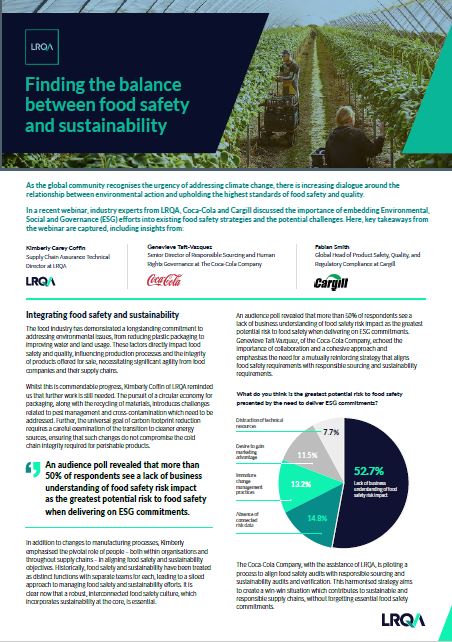 最近のウェビナーでは、LRQA、コカ・コーラ、カーギルの専門家が、既存の食品安全戦略にESG(環境・社会・ガバナンス)の取り組みを組み込むことの重要性と、潜在的な課題について議論しました。本資料では、ウェビナーから得られた主な洞察をご紹介します。